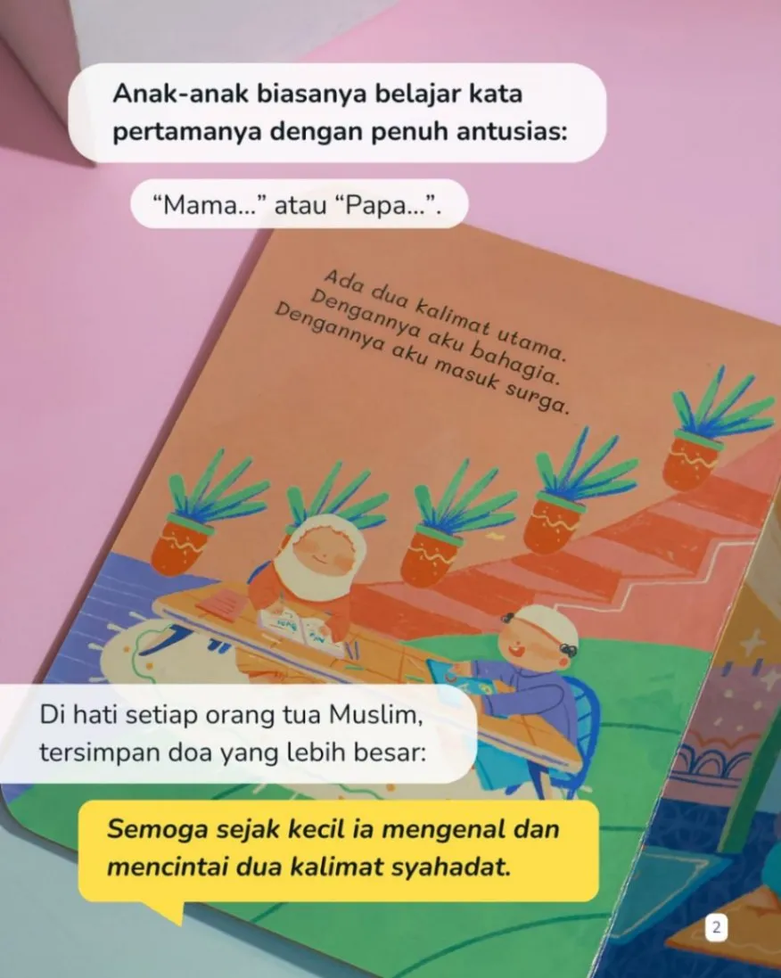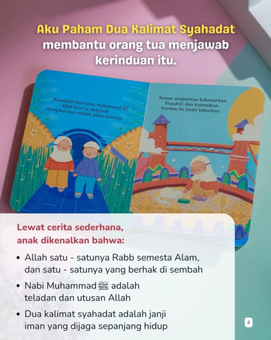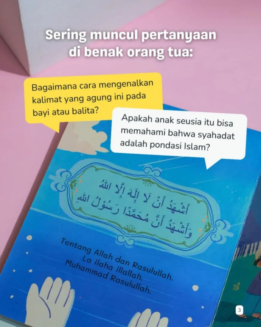 Penanaman Aqidah harus mendapatkan perhatian besar dari orangtua maupun pendidik. Menanamkan dalam jiwa si kecil tentang ke-Esaan Allah, dan menjauhkan si kecil dari perbuatan syirik. Pendidikan aqidah bagi si kecil bertujuan untuk membentuk jiwa anak yang berkepribadian Islam, yaitu memiliki aqidah Islam sebagai landasan ketika berpikir dan bersikap didalam menjalani kehidupan. Beberapa tujuan pendidikan aqidah pada si kecil adalah untuk, ● Memperkokoh keyakinan si kecil bahwa Allah-lah satu-satunya Tuhan pencipta alam, sehingga si kecil terhindar dari perbuatan syirik ● Agar si kecil mengetahui hakikat keberadaannya sebagai makhluk Allah ● Mencetak tingkah laku anak menjadi tingkah laku seorang Muslim yang berakhlaq mulia. Udah tau kan, tasmeem punya buku Seri Aqidah loh Buku apa yaa? Boardbook " " In syaa Allah menemani ayah bunda untuk menanamkan bibit pondasi utama akidah untuk si kecil. Mengapa dua kalimat syahadat? Sebab keduanya adalah kunci diterimanya amalan kita dan kunci masuk surga. Bila dua kalimat syahadat seorang hamba bagus maka permasalahan aqidah dan ibadah lainnya juga akan bagus. Spesifikasi: ● Sampul : Boardbook ● Kertas : Grayboard 1.500 gsm ● Tebal : 8 Halaman (single page) ● Ukuran : 10 x 10 cm ● Berat : 450 gram