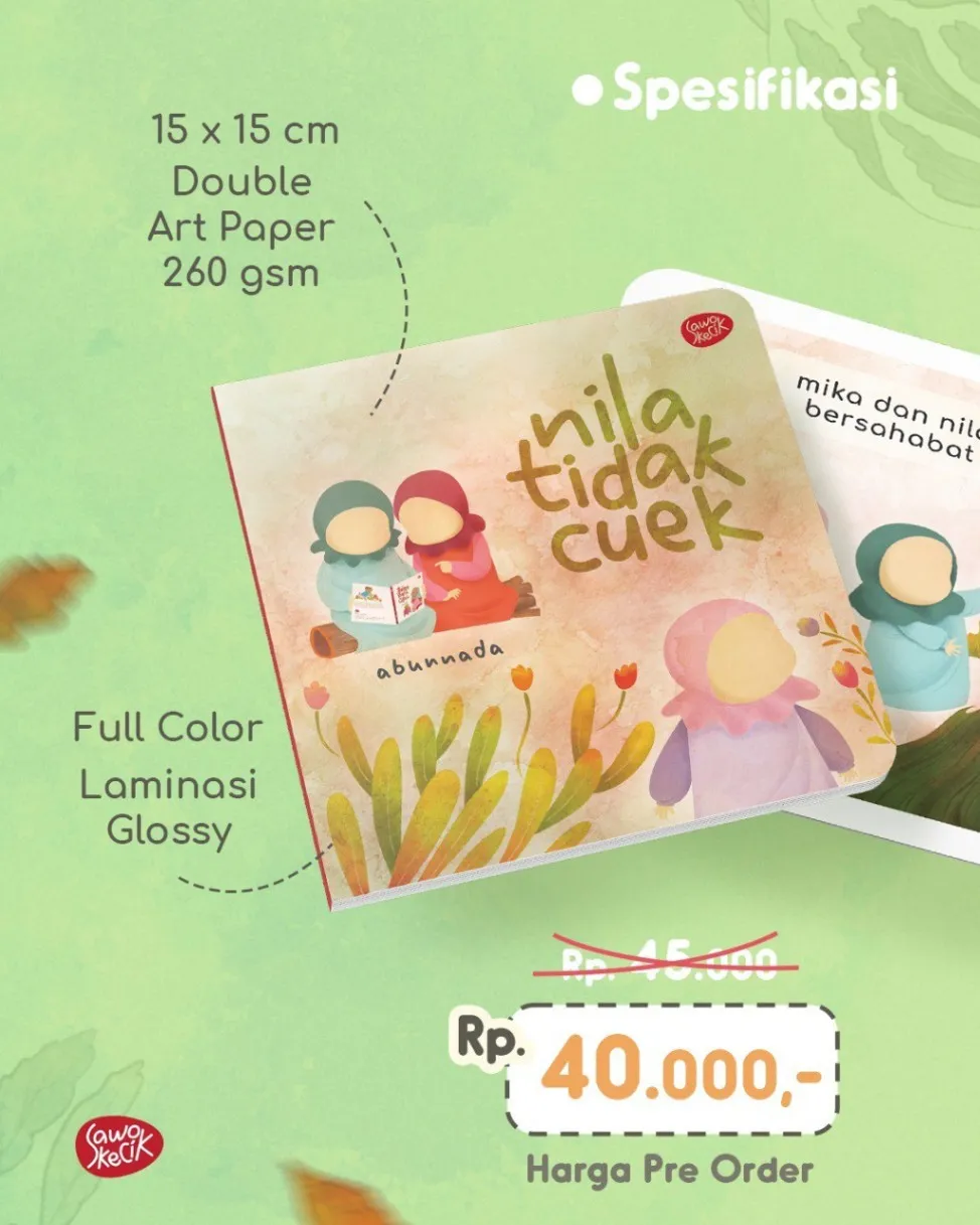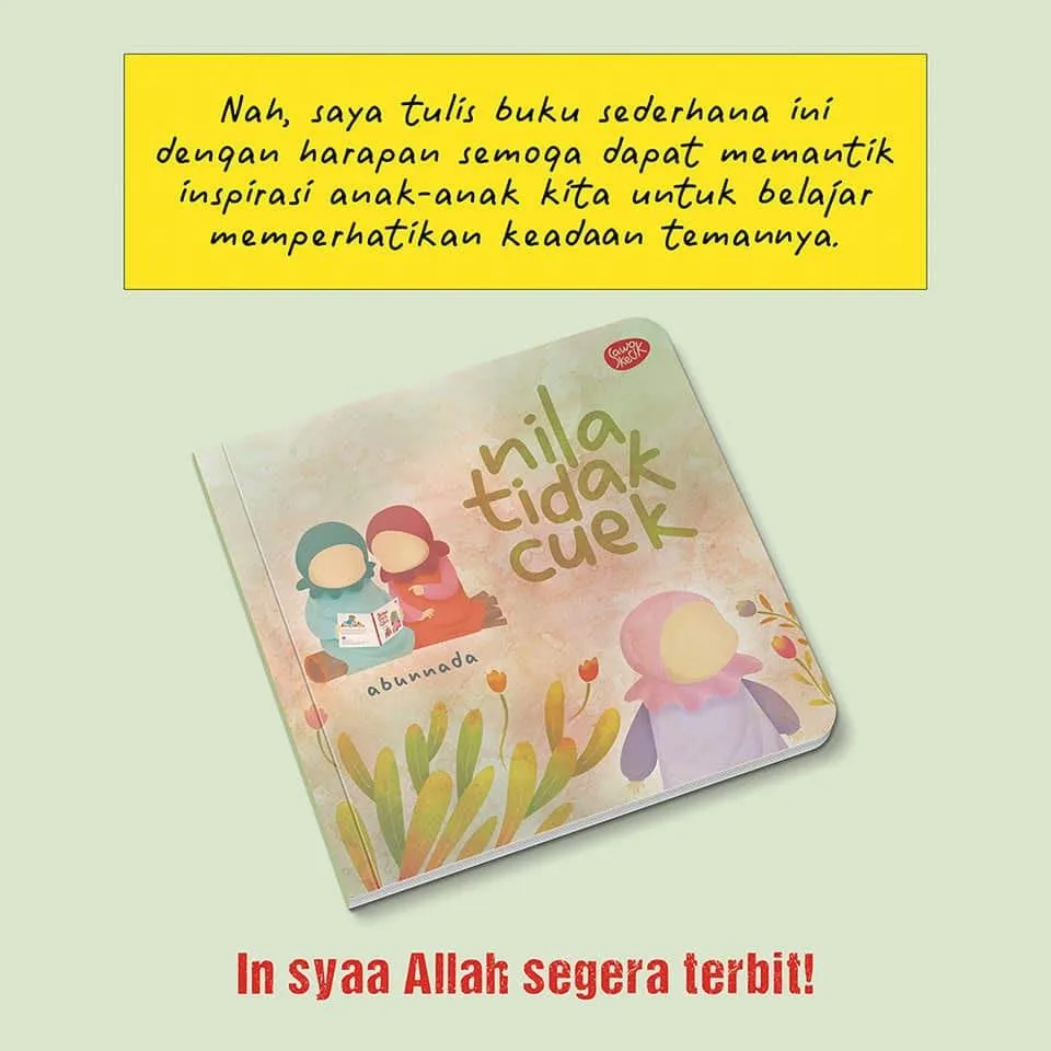 Bismillah. Boardbook anak "Nila Tidak Cuek" karya Abunnada, sudah dapat dipesan. Kesempatan pre order di buka sampai tanggal 10 Maret 2023 mendatang. Buku ini menceritakan persahabatan dua gadis cilik bernama Nila dan Mika. Mereka selalu bermain dan belajar bersama. Pada suatu ketika, ada sikap Nila yang membuat hati Mika merasa sedih. Nila tidak menyadarinya. Apa yang dilakukan Nila untuk memperbaiki keadaan itu? Buku sederhana ini dibuat dengan harapan dapat menjadi media bantu untuk merangsang rasa empati pada anak, agar mereka lebih peka dengan perasaan temannya. Spesifikasi: ● Sampul : Boardbook ● Kertas : Art Paper ● Tebal : 20 Halaman ● Ukuran : 15 x 15 cm ● Berat : 200 gram