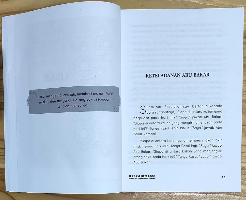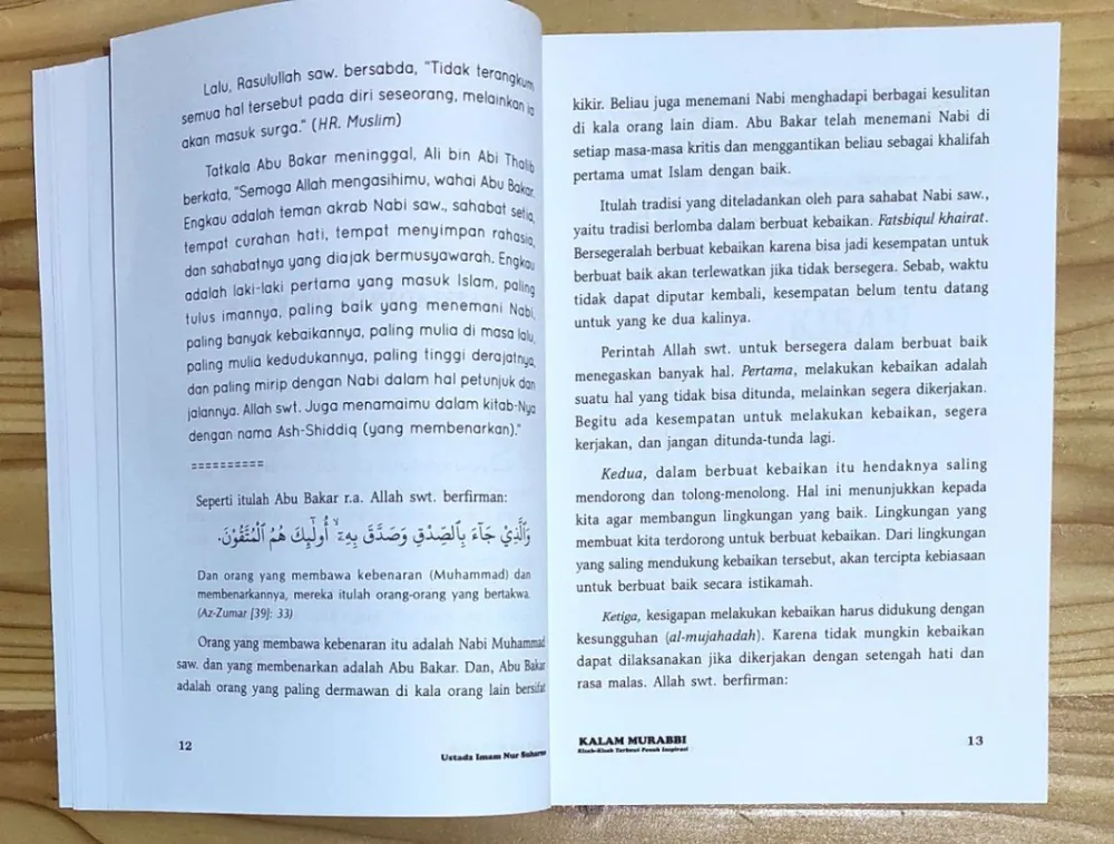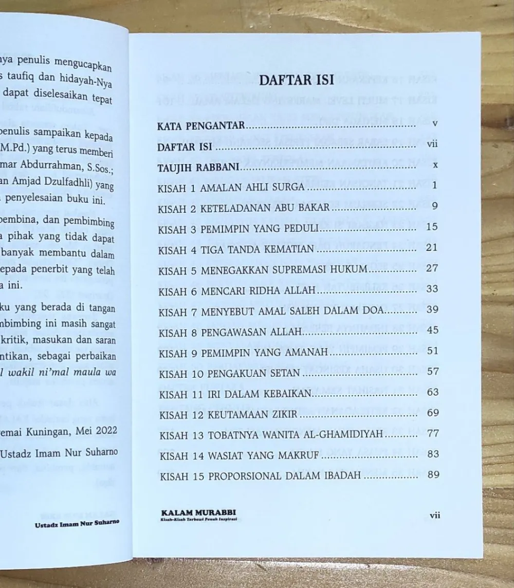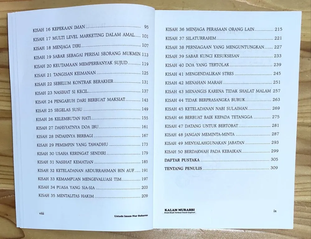 Kalam Murabbi "Kisah-kisah Trabawi Penuh Inspirasi yang Menyentuh Hati" Penulis : Ustadz Imam Nur Suharno Penerbit : Era Adicitra Intermedia Kalam Murabbi Jilid 1: Kesan pertama seorang murabbi di mata binaannya ditentukan salah satunya oleh seperti apa murabbi itu membuka halaqahnya. Dalam teori komunikasi, momen empat menit pertama merupakan momen krusial yang menentukan kesan menarik-tidaknya sebuah pembicaraan. Oleh karena itu, selain ketulusan niat, seorang murabbi membutuhkan persiapan matang guna dapat menarik hati dan simpati para binaannya. Buku Kalam Murabbi; Kisah-Kisah Tarbawi Penuh Inspirasi ini disusun sebagai ikhtiar untuk membantu para murabbi mempersiapkan kalimat pembuka halaqah yang kuat, menggugah, dan inspiratif. Berisi kisah-kisah tarbawi yang diambil dari Al-Quran, Hadits, dan sirah nabi serta salafusaleh, dilengkapi dengan pembahasan singkat tentang hikmah-hikmah yang terkandung di dalamnya. Buku ini semakin layak dimiliki karena tema kisah di dalamnya disesuaikan dengan tema-tema KKP di berbagai jenjang, sehingga praktis dan siap pakai. Kalam Murabbi Jilid 2: Saudara-saudari sekalian, jangan sampai ketinggalan untuk mendapatkan harga spesial selama masa Pre Order dari buku "Kalam Murabbi 2" Insya Allah, buku tersebut dapat menjadi penyemangat diri kita untuk mengisi halaqah di pertemuan-pertemuan selanjutnya. Yuk, digercepin sekarang juga!!! Apa Keistimewaan dari Buku Kalam Murabbi 2? 1. Cocok untuk materi pembukaan halaqah. 2. Dikemas praktis dalam bentuk kisah. 3. Tema kisah di dalamnya disesuaikan dengan tema-tema KKP di berbagai jenjang. 4. Dilengkapi Quotes dari penulis dan Khulafa’ Ar-Rasyidin 5. Dilengkapi dalil Al-Qur’an dan hadits yang sahih Spesifikasi: ● Sampul : Soft Cover ● Kertas : HVS 70 gsm ● Tebal : 320 / buku ● Ukuran : 14,5 x 20,5 cm ● Berat : 400 gram / buku
