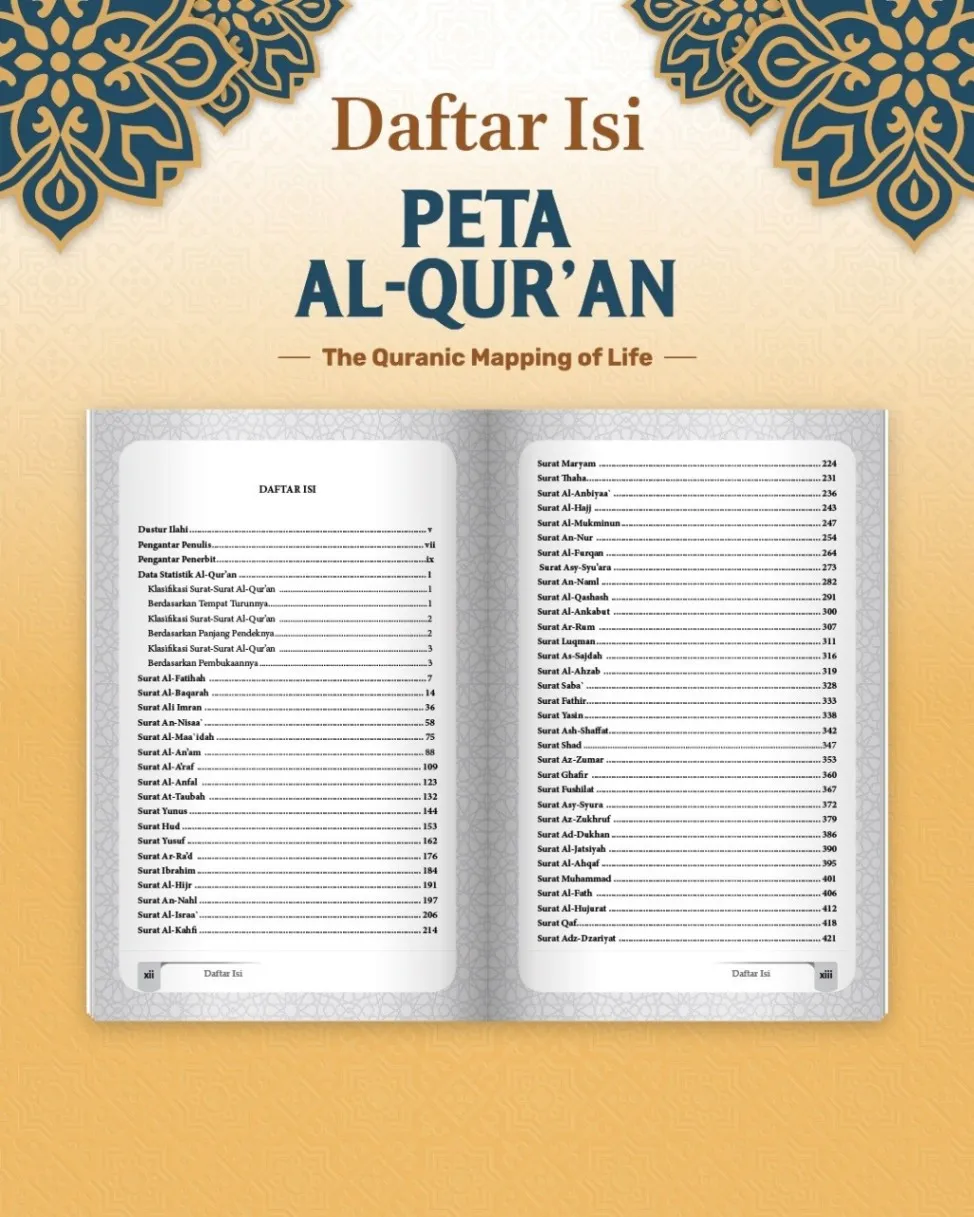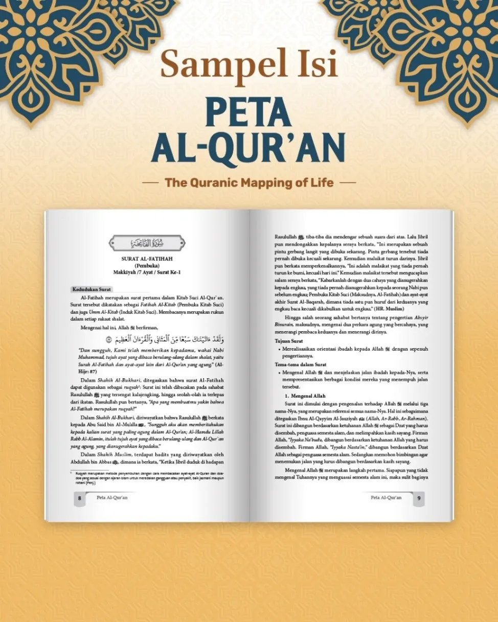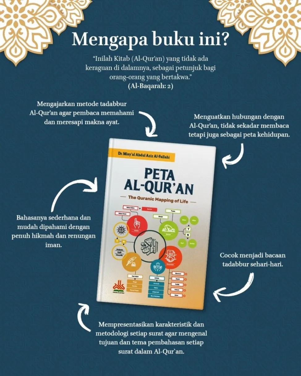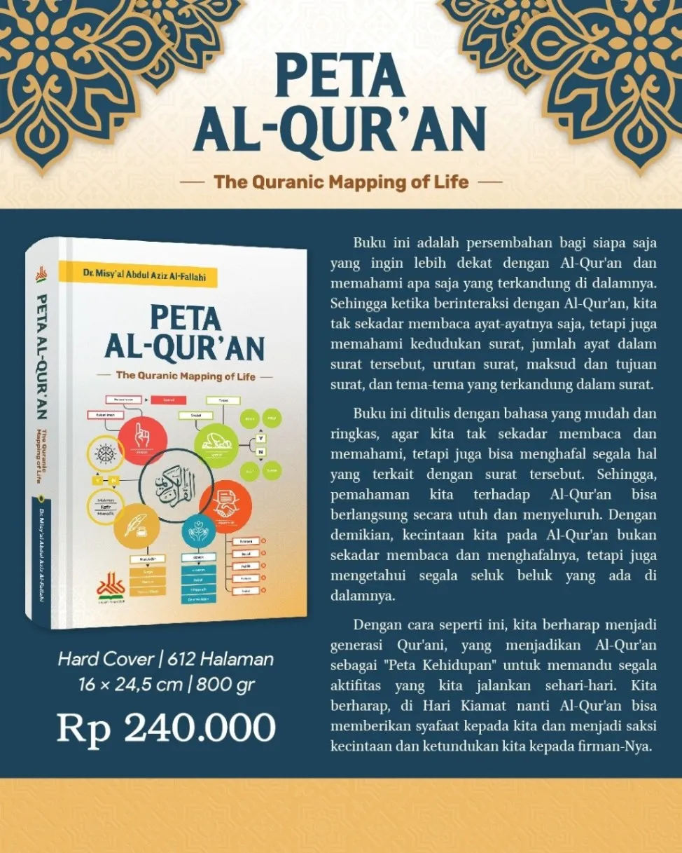Peta Al Qur'an The Quranic Mapping Of Life Penulis : Dr. Misy'al Abdul Aziz Al-Fallahi Penerbit : Pustaka Al Kautsar Buku ini adalah persembahan bagi siapa saja yang ingin lebih dekat dengan Al-Qur'an dan memahami apa saja yang terkandung di dalamnya. Sehingga ketika berinteraksi dengan Al-Qur'an, kita tak sekadar membaca ayat-ayatnya saja, tetapi juga memahami kedudukan surat, jumlah ayat dalam surat tersebut, urutan surat, maksud dan tujuan surat, dan tema-tema yang terkandung dalam surat. Buku ini ditulis dengan bahasa yang mudah dan ringkas, agar kita tak sekadar membaca dan memahami, tetapi juga bisa menghafal segala hal yang terkait dengan surat tersebut. Sehingga, pemahaman kita terhadap Al-Qur'an bisa berlangsung secara utuh dan menyeluruh. Dengan demikian, kecintaan kita pada Al-Qur'an bukan sekadar membaca dan menghafalnya, tetapi juga mengetahui segala seluk beluk yang ada di dalamnya. Dengan cara seperti ini, kita berharap menjadi generasi Qur'ani, yang menjadikan Al-Qur'an sebagai "Peta Kehidupan" untuk memandu segala aktifitas yang kita jalankan sehari-hari. Kita berharap, di Hari Kiamat nanti Al-Qur'an bisa memberikan syafaat kepada kita dan menjadi saksi kecintaan dan ketundukan kita kepada firman-Nya. Spesifikasi: ● Sampul : Hard Cover ● Kertas : Bookpaper ● Tebal : 612 Halaman ● Ukuran : 16 x 24,5 cm ● Berat : 850 gram Harga : Rp240,000,-
